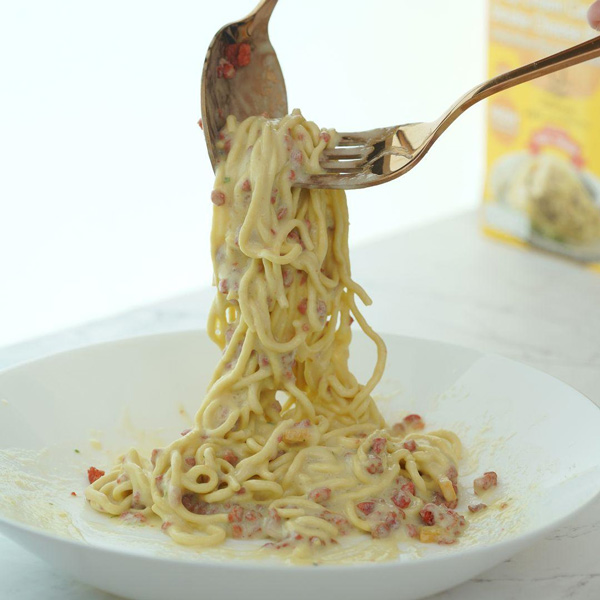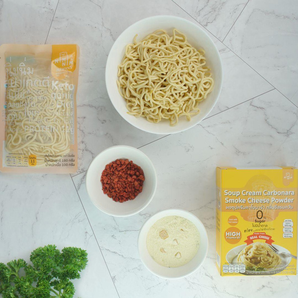 “ในส่วนของผงซุปครีมคาโบนาร่า ปกติแล้ว เวลาเรากินสปาเก็ตตี้คาโบนาร่า เราก็อาจจะรู้สึกว่ามันอร่อย แต่คงกินได้ไม่บ่อยเพราะไขมัน แคลอรี่ และคอเลสเตอรอลสูง เพราะมีชีส และมันเนยเป็นส่วนผสม เราจึงใช้ความรู้ในเรื่องของวัตถุดิบ รวมกับสิ่งที่เราพยายามทดลองด้วยโจทย์ว่าทำยังไงให้ได้ผงคาโบนาร่าที่ทำได้สะดวก รับประทานง่าย และต้องแคเลอรี่-ไขมันต่ำ แต่ยังคงความอร่อยแบบคาโบนาร่าแท้ ๆ”