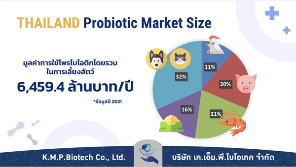 ขณะที่ตลาด Probiotic ประเทศไทยมีมูลค่าอยู่ที่ 4.1 พันล้านบาทต่อปี ส่วนการใช้ Probiotic ในการเลี้ยงสัตว์ก็มีมูลค่าสูงกว่า 6.4 พันล้านบาท และมีการคาดการณ์ว่าภายในปี 2026 ตลาด Probiotic บ้านเราจะมีมูลค่าสูงถึง 9.1 พันล้านบาท ซึ่งจะมีอัตราความเจริญเติบโตต่อปีสูงถึง 12.21 % เลยทีเดียว