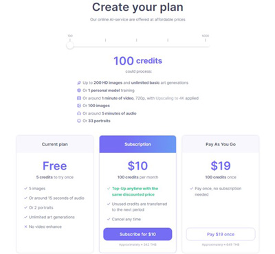 แพลตฟอร์มที่ใช้งานโดยจ่ายเป็น Credit เหมือนกับ Nightcafe โดยจะมี 5 Credits ให้ฟรีเมื่อสมัครใช้งาน หลังจากนั้นผู้ใช้สามารถเลือกแผนการใช้งานได้ว่าต้องการซื้อกี่ Credit ต่อเดือน หรือต่อครั้ง ซึ่งกำหนดขั้นต่ำ 100 Credits ในราคา 10$ ต่อเดือน ตามรายละเอียดในภาพด้านล่าง