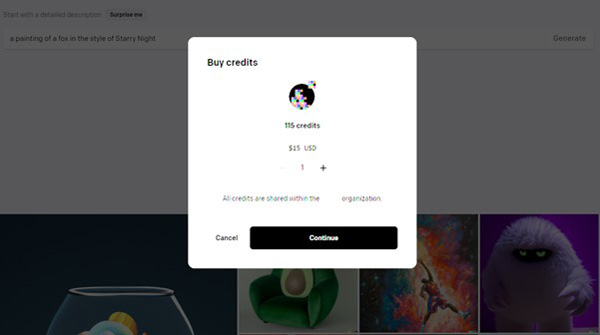Openai ใช้ Credit ในการสร้างภาพ ผู้ใช้สามารถเลือกซื้อได้ตั้งแต่ขั้นต่ำ 115 Credits เป็นจำนวนเงิน 15$ ซึ่งการ Generate จะใช้ 1 Credit ต่อการ Generate 1 ครั้ง และ Credit จะมีอายุการใช้งานได้เพียง 12 เดือนเท่านั้น นับจากวันที่ซื้อ