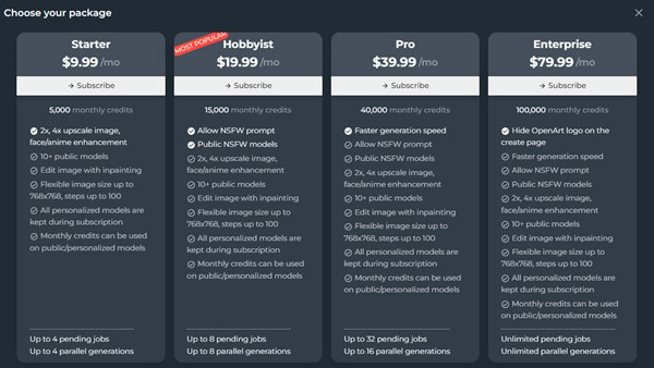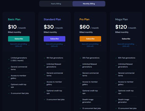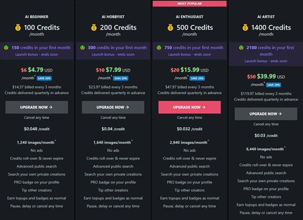 ในส่วนของการสร้างภาพบนเว็บไซต์นี้จะต้องจ่าย Credit เช่นเดียวกับแพลตฟอร์มอื่น ๆ ที่กล่าวมาข้างต้น แต่จะมี Credits ฟรีให้ทดลองใช้ 200 Credits โดยจะใช้ขั้นต่ำ 1 Credits ต่อการสร้าง 1 ภาพ หากผู้ใช้งานต้องการซื้อ Credit เพิ่ม ก็มีแพ็กเกจแบบรายเดือนให้บริการเช่นกัน เริ่มต้นที่เดือนละ 9.99$