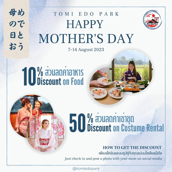 นอกจากนี้ โทมิเอโดะพาร์ค ยังร่วมส่งมอบความสุขสู่คุณแม่ทุก ๆ โดยมอบส่วนลดค่าอาหาร และค่าเช่าชุด เมื่อพาคุณแม่มาร่วมเช็คอินที่ร้านในเทศกาลวันแม่ปีนี้อีกด้วย