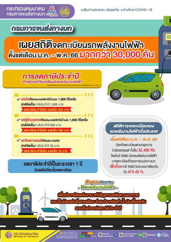 ทั้งนี้ กรมการขนส่งทางบก รายงานสถิติยอดจดทะเบียนรถพลังงานไฟฟ้า ตั้งแต่เดือน ม.ค.-พ.ค. 66 มีทั้งสิ้น 32,450 คัน โดยในปี 2566 มีรถยนต์พลังงานไฟฟ้ามาจดทะเบียนที่ ขบ. เพิ่มขึ้นจากปี 2565 ในช่วงเวลาเดียวกันถึง 474.43 % แสดงให้เห็นถึงความสนใจที่ประชาชนหันมาใช้รถยนต์ไฟฟ้าเพิ่มมากขึ้น