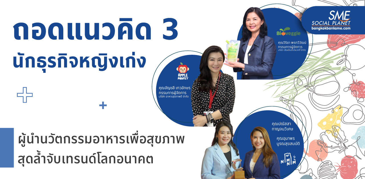 บทความนี้ Bangkok Bank SME จะพาไปดูกรณีศึกษา 3 ผู้บริหารหญิงต้นแบบคนรุ่นใหม่ ที่ใช้นวัตกรรม สร้างสินค้านวัตกรรมอาหารรูปแบบใหม่รับเทรนด์สุขภาพยุคดิจิทัล เนื่องจากผู้บริโภคหันมาใส่ใจสุขภาพมากขึ้น ต้องการอาหารที่มีคุณภาพ สะดวก ปลอดภัย ตอบโจทย์ความต้องการเฉพาะบุคคล เป็นผู้นำในธุรกิจอาหาร ที่ใช้นวัตกรรมเพิ่มความสามารถ ตอบโจทย์เทรนด์ผู้บริโภคที่รักสุขภาพ