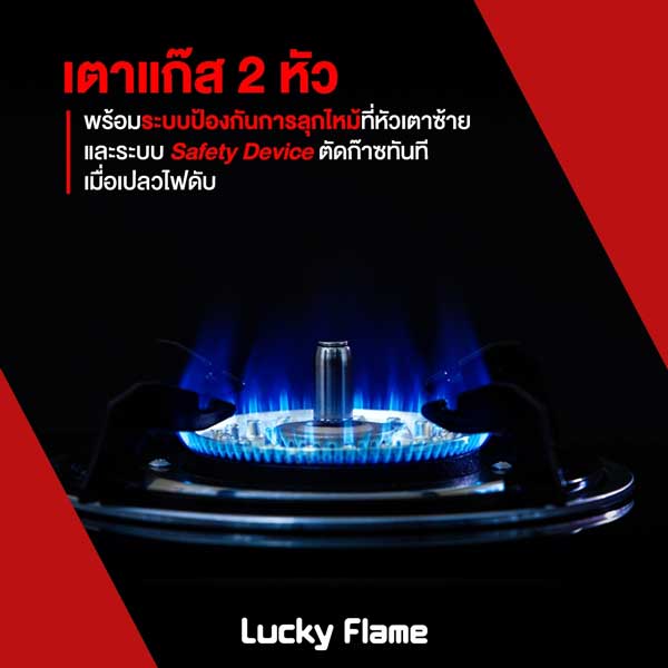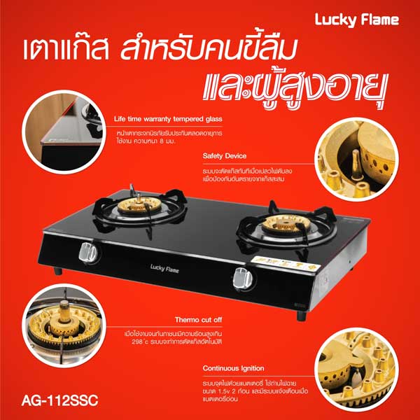 แล้วก็มีอีกหนึ่งความปลอดภัยก็คือ เมื่อเรากำลังเปิดเตาแก๊สแล้วมีลมทำให้เปลวไฟในเตาดับ หรือน้ำในหม้อล้นออกมาทำให้เปลวไฟดับ หากเป็นเตาทั่วไปแก๊สก็ยังจะถูกปล่อยออกมา แต่เตาแก๊ส ‘ลัคกี้เฟลม’ รุ่น AG-112SSC และรุ่น AG-112SS จะตัดแก๊สทันที เพื่อไม่ให้เกิดอันตราย