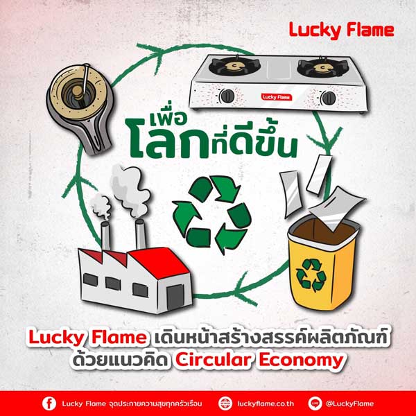 คุณเชาว์เลิศ เล่าให้เห็นภาพว่า นอกจากสินค้า ‘ลัคกี้เฟลม’ จะได้รับเครื่องหมาย มอก. ซึ่งบังคับในเรื่องการปล่อยก๊าซคาร์บอนมอนออกไซด์ (CO) จากการเผาไหม้ โดยต้องปล่อยคาร์บอนน้อยกว่า 1,000 ppm (part per million) แล้ว บริษัทยังมีการใส่ใจสิ่งแวดล้อมด้านอื่นๆ ด้วย เช่น ในส่วนโรงงานผลิตปัจจุบันได้รับการรับรอง Green Industry