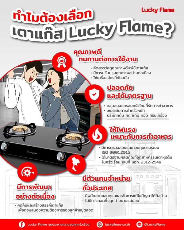 ด้วยวิสัยทัศน์การทำธุรกิจของคุณเชาว์เลิศ ลีลาศวัฒนกุล รองกรรมการผู้จัดการ บริษัท ลัคกี้เฟลม จำกัด ที่เข้าใจพฤติกรรมผู้บริโภคแล้วตอบโจทย์อย่างตรงจุด ส่งผลให้สินค้าแบรนด์ ‘ลัคกี้เฟลม’ ประสบความสำเร็จเป็นเบอร์ 1 เรื่องเตาแก๊สเมืองไทย โกอินเตอร์ให้ทั่วโลกรู้จักอีกกว่า 30 ประเทศ แต่ถึงอย่างนั้นก็ยังมีการพัฒนาอย่างต่อเนื่องไม่ยั้งหยุด เพื่อจุดประกายความสุขทุกครัวเรือน สร้างชื่อสู่การเป็นแบรนด์เตาแก๊สแถวหน้าของโลกในอนาคต