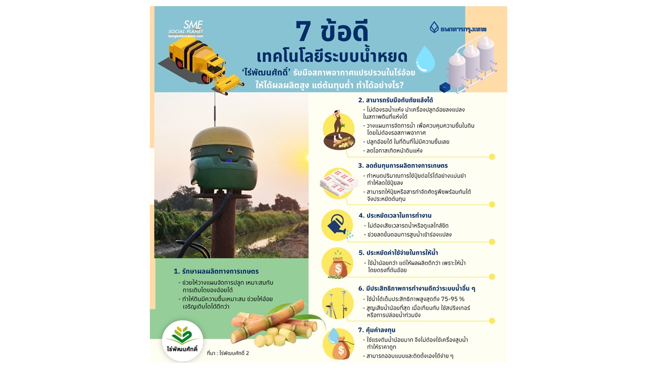 ชาวไร่อ้อยยังสามารถเพาะปลูกโดยไม่ต้องรอปัจจัยเรื่องน้ำ หรือสภาพอากาศ วางแผนจะแม่นยำมากขึ้น สูญเสียน้อย และขายผลผลิตได้ราคาที่ดีขึ้นด้วย ซึ่งการทำระบบน้ำหยดยังมีข้อดีในการช่วยอำนวยความสะดวกสำหรับทำการเกษตรอีกมากมาย มาดูกันว่ามีอะไรบ้าง