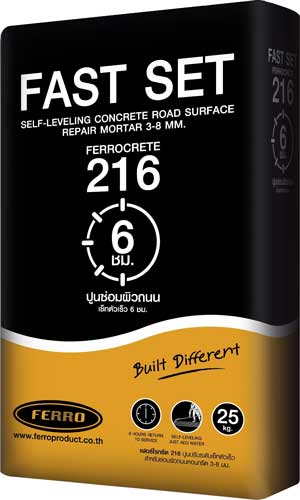 สำหรับ ‘เฟอร์โรกรีต 216’ อธิบายให้เห็นภาพก็คือ จะเป็นปูนสำหรับซ่อมผิวถนนความหนาระหว่าง 3 - 8 มิลลิเมตร ซึ่งมีจุดเด่นสำคัญก็คือรถยนต์ทั้ง รถบรรทุก หรือ 4 ล้อทั่วไป สามารถสัญจรผ่านบริเวณที่ซ่อมแซมได้ภายใน 3 - 6 ชั่วโมง ซึ่งเป็น Know How ของบริษัท เมื่อรถบรรทุกขับบนพื้นผิวที่ซ่อมแซมแล้วไม่เกิดการยุบตัว) และมีผิวเนียนสวย นอกจากนี้ยังช่วยลดการเกิดราดำ เนื่องจากมีสารป้องกันราดำ โดยพื้นผิวถนนคอนกรีตที่ไม่สวยงามหรือพื้นสึกเป็นบางที่ สามารถนำปูนนี้ไปปิดทับได้เลย โดยผลิตภัณฑ์จะมีกาวสูตรพิเศษเป็นส่วนผสมทำให้เกาะแน่นอยู่ได้นานหลายปี