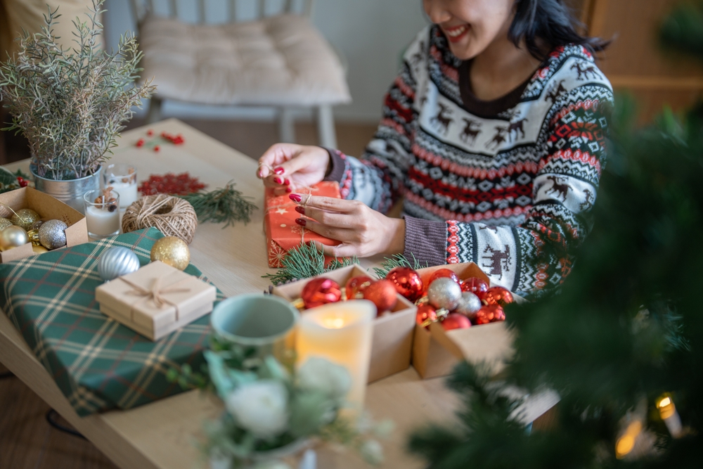 - นำกระดาษห่อของที่มีอยู่มาตกแต่ง เพิ่มลูกเล่นด้วยการใช้ริบบิ้นสีสดใส หรือสติกเกอร์ลายคริสต์มาสวาดภาพหรือเขียนข้อความอวยพรลงบนกระดาษห่อของ ใช้กิ่งไม้สนหรือใบกระพ้อมาประดับเพิ่มความเป็นธรรมชาติ