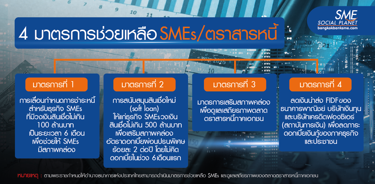 นายวิรไท สันติประภพ ผู้ว่าการธนาคารแห่งประเทศไทย (ธปท.) เปิดเผยว่า ธปท. การแพร่ระบาดมีแนวโน้มรุนแรงและยาวนานกว่าคาด จึงมีมาตรการเพิ่มเติมเพื่อช่วยเหลือผู้ประกอบการ SMEs ซึ่งเป็นภาคส่วนที่มีความสำคัญต่อเศรษฐกิจไทยและเป็นแหล่งการจ้างงานหลักของประเทศ ให้มีเงินทุนและสภาพคล่องเพียงพอเพื่อดำเนินธุรกิจและรักษาการจ้างงานต่อไปได้ รวมทั้งต้องมีมาตรการเพื่อดูแลเสถียรภาพตลาดตราสารหนี้ภาคเอกชน เพื่อรักษาช่องทางการระดมทุนของภาคเอกชนและรักษาเสถียรภาพของระบบเศรษฐกิจและการเงินของประเทศ โดยมาตรการในครั้งนี้จะประกอบด้วย 4 ส่วนที่สำคัญ