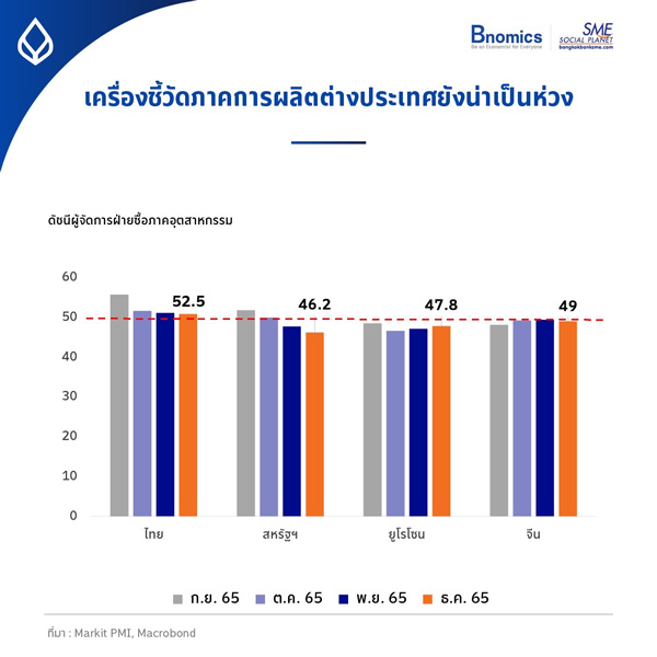 หรือกลุ่มยูโรโซน ที่แม้ตัวเลข PMI จะปรับมาดีขึ้นเล็กน้อยจาก 47.1 มาอยู่ที่ 47.8 แต่ก็ยังอยู่ในระดับต่ำกว่า 50 ซึ่งสะท้อนการหดตัวในช่วงถัดไปอยู่ อันเกิดมาจากปัญหาราคาพลังงานและอัตราเงินเฟ้อสูงที่ยังเป็นปัญหาสำคัญของพวกเขาที่ยังไม่จบ