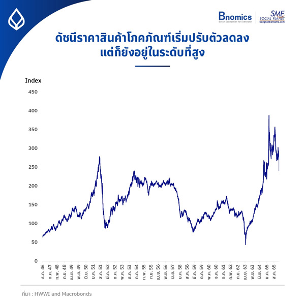 อ้างอิงจาก HWWI ดัชนีราคาสินค้าโภคภัณฑ์โลกซึ่งเป็นกลุ่มสินค้าสำคัญต่ออัตราเงินเฟ้อ แสดงให้เห็นว่า ราคาสินค้าโภคภัณฑ์ปรับตัวลดลงมาแล้วอย่างมาก จากระดับสูงสุดของปีที่แล้วที่ดัชนีขึ้นไปแตะระดับ 388.2 แต่ตอนนี้ดัชนีลงมาสู่ระดับต่ำกว่า 250 แล้ว