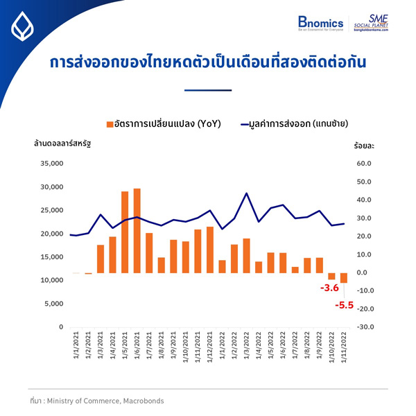 ภาคการส่งออกที่เป็นเครื่องยนต์สำคัญของเศรษฐกิจไทยในช่วงปี 2564 และช่วงแรกของปี 2565 อ่อนแรงลงอย่างต่อเนื่อง จนการส่งออก 2 เดือนล่าสุด คือ ตุลาคม (-3.6%) และพฤศจิกายน (-5.5%) กลับทิศทางจากขยายตัวมาเป็นหดตัว