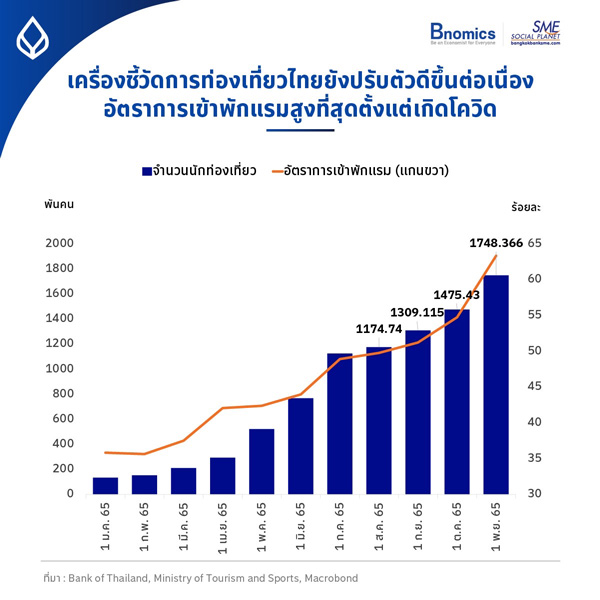นอกจากนี้ ข้อมูลอัตราการเข้าพักแรมล่าสุดในเดือนพฤศจิกายน ปรับตัวขึ้นไปอยู่ระดับมากกว่า 60% แล้ว ถือเป็นระดับที่สูงสุด นับตั้งแต่เดือนมกราคม 2563 ชี้ให้เห็นว่า การท่องเที่ยวอยู่ในทิศทางบวกอย่างแข็งแกร่ง