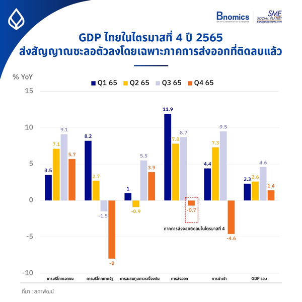 โดยสถานการณ์ภาคการส่งออกของไทยจากที่เคยเป็นเครื่องยนต์หลักทางเศรษฐกิจในช่วงการแพร่ระบาดของโควิด ก็ปรับกลับมาชะลอตัวลงตั้งแต่ช่วงปลายปี 2565 จนถึงปัจจุบัน เนื่องจากได้รับผลกระทบจากสภาวะความไม่แน่นอนทางเศรษฐกิจที่เกิดขึ้นทั่วโลก ยืนยันได้จากตัวเลข GDP ในไตรมาสที่ 4 ปี 2565 ที่ประกาศออกมา