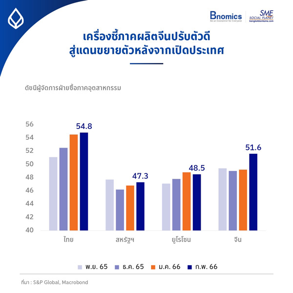 สถานการณ์การเปิดประเทศของจีนยังส่งผลให้ดัชนีผู้จัดการฝ่ายซื้อภาคการผลิต (Manufacturing PMIs) ของจีนปรับตัวขึ้นมาอยู่ในแดนขยายตัว (เกิน 50) ที่ 51.6 เป็นระดับที่มากที่สุดในรอบ 8 เดือน