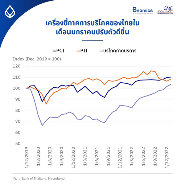อย่างไรก็ดี ข้อมูลสถานการณ์เศรษฐกิจไทยภายในประเทศล่าสุดในเดือนมกราคมก็ยังมีสัญญาณบวกบางประการอยู่ อันเกิดมาจากความเชื่อมั่นของผู้บริโภคภายในประเทศที่ปรับตัวดีขึ้น การบริโภคภาคบริการที่ฟื้นตัวต่อเนื่อง และมาตรการกระตุ้นการใช้จ่ายภาครัฐ