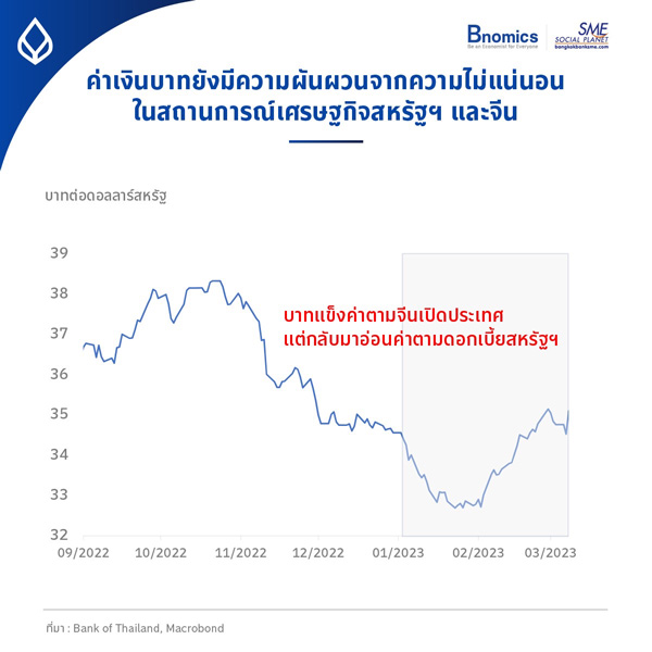 อย่างไรก็ดี การอ่อนค่าของเงินบาทเมื่อเทียบกับดอลลาร์สหรัฐในช่วงนี้ เกิดขึ้นหลังจากการแข็งค่าของเงินบาทในช่วงสองเดือนแรกของปี 2566 อันมีเหตุผลสำคัญมาจากการเปิดประเทศของจีน ซึ่งทำให้มีการคาดการณ์ว่าประเทศไทยจะมีนักท่องเที่ยวต่างชาติมากขึ้นในปีนี้ และมีรายได้ภาคบริการไหลเข้าจากต่างประเทศมากขึ้นและทำให้เงินบาทแข็งค่า