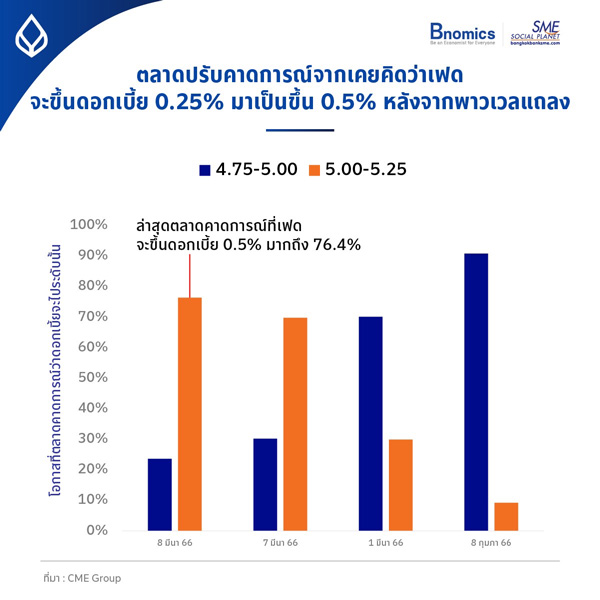 แต่หลังจากที่พาวเวลออกมาแถลงการณ์ การคาดการณ์ว่าธนาคารกลางสหรัฐฯ จะปรับดอกเบี้ยขึ้น 0.5% ปรับขึ้นมาอยู่ที่ระดับ 76.4% แล้ว (อ้างอิงวันที่ 8 มีนาคม) แสดงให้เห็นว่า คนในตลาดส่วนปรับการคาดการณ์จากขึ้น 0.25% มาเป็นการขึ้นดอกเบี้ย 0.5% แล้ว