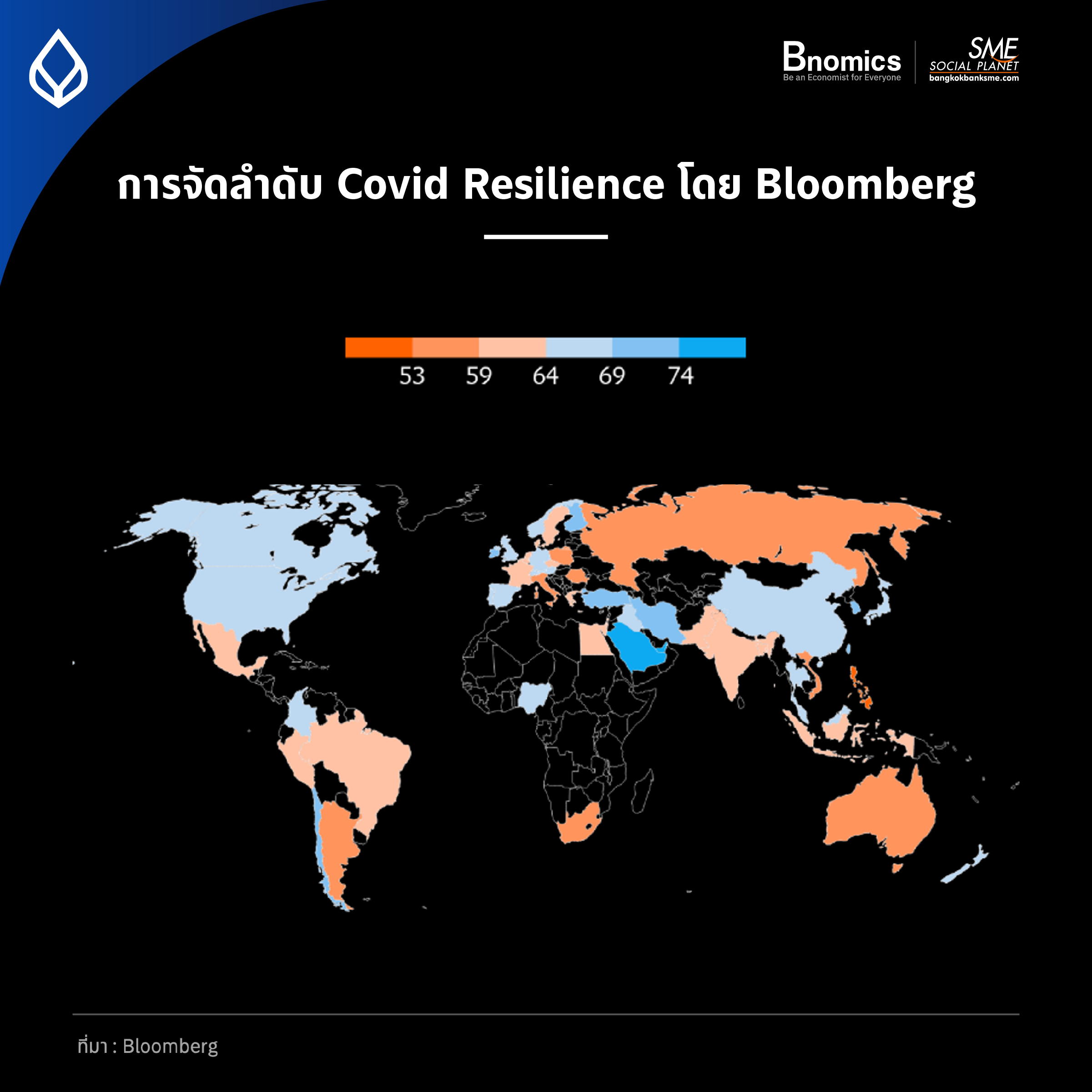 ประเทศไทยถูกจัดลำดับ Covid Resilience Ranking โดย Bloomberg ให้อยู่ในลำดับที่ 26 จากทั้งหมด 53 ประเทศในเดือนมกราคม 2565 (ดีขึ้นจากเดิมอยู่ในลำดับที่ 44 ในเดือนธันวาคม 2564) ซึ่งการจัดลำดับนี้จะวัดจาก สถานการณ์การแพร่ระบาดของโควิด-19 ในประเทศนั้น ๆ อัตราการฉีดวัคซีน ความรุนแรงของการล็อกดาวน์ และ Mobility ของคนในประเทศ เป็นต้น ถ้าหากประเทศอยู่ในลำดับต้นๆ (มีคะแนนมาก) สามารถตีความได้ว่าประเทศนั้นๆ จัดการกับการแพร่ระบาดของโควิด-19 ได้ดีที่สุด โดย ณ ตอนนี้ประเทศที่จัดการกับโควิดได้ดีที่สุด 3 ลำดับแรกได้แก่ สหรัฐอาหรับเอมิเรตส์ ซาอุดิอาระเบีย และ ฟินแลนด์ ตามลำดับ