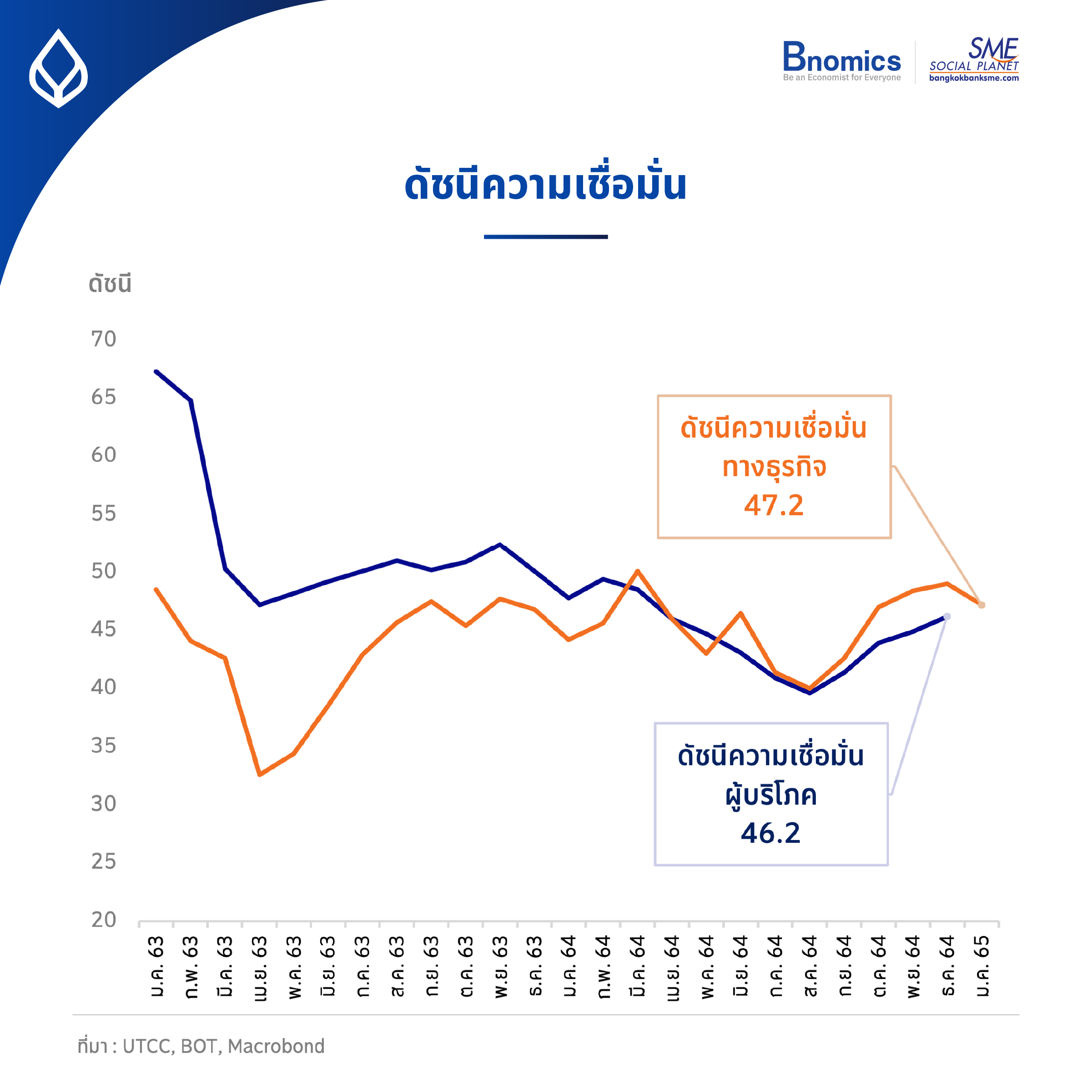 ส่วนดัชนีความเชื่อมั่นทางธุรกิจในเดือนมกราคม 2565 ลดลงมาอยู่ที่ระดับ 47.2 จาก 49.0 ในเดือนก่อนหน้า เพราะผู้ประกอบการยังคงมีความกังวลต่อราคาต้นทุนที่อาจปรับเพิ่มขึ้นตามราคาน้ำมันที่เพิ่มขึ้น (ราคาน้ำมันดิบ Brent อยู่ใกล้ระดับสูงสุดในรอบ 7 ปี ในช่วงที่ผ่านมา) นอกจากนั้นการแพร่ระบาดของโควิด-19 ยังคงกระทบต่อความเชื่อมั่นของผู้ประกอบการบางกลุ่ม โดยเฉพาะในธุรกิจร้านอาหาร โรงแรม หรือภาคบริการอื่น ๆ