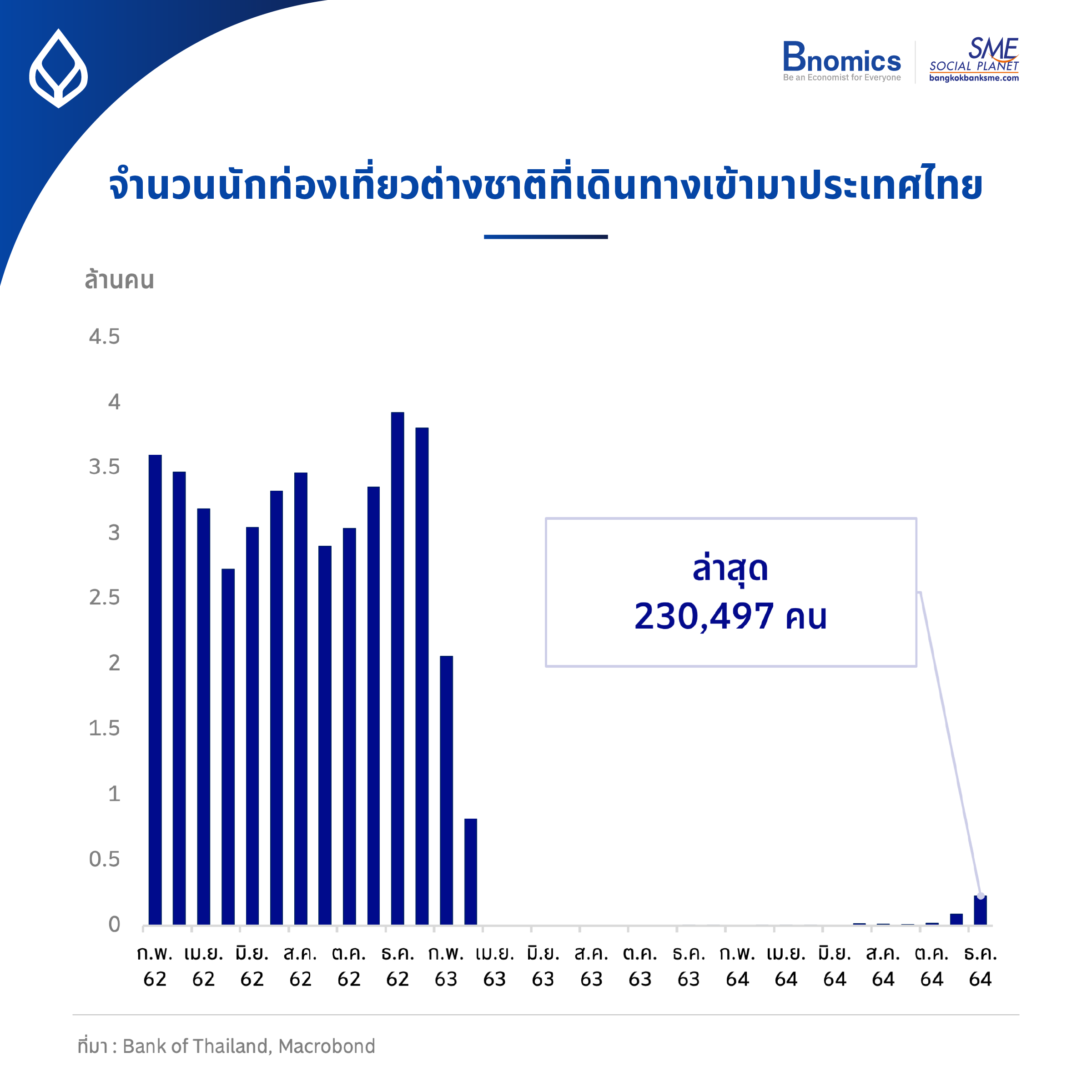 ทั้งนี้ จากข้อมูลของธนาคารแห่งประเทศไทยพบว่าประเทศไทยได้มีนักท่องเที่ยวต่างชาติเดินทางเข้ามาทั้งสิ้นจำนวนกว่า 230,500 คนในช่วงเดือนธันวาคม โดยถือว่าเป็นจำนวนมากที่สุดในรอบเกือบ 2 ปีที่มีการแพร่ระบาดของโควิด-19 และทั้งปี 2564 ที่ผ่านมามีจำนวนนักท่องเที่ยวทั้งสิ้นประมาณ 430,000 ราย ยังคงน้อยกว่าปี 2563 ที่มีจำนวนนักท่องเที่ยวราว 6.7 ล้านคน (เนื่องจากไตรมาสแรกปี 2563 ประเทศไทยยังไม่ได้มีมาตรการปิดประเทศ จึงทำให้นักท่องเที่ยวยังคงเดินทางมาในจำนวนมาก)
