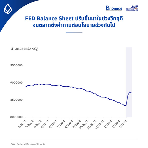 นอกจากนี้ ก็ยังมีส่วนการอัดสภาพคล่องเข้าไปสู่ภาคธนาคารบางส่วน จนทำให้ Fed Balance Sheet ปรับขึ้นมากว่า 3 แสนล้านดอลลาร์สหรัฐ ทั้ง ๆ ที่ก่อนหน้านี้เฟดทำการลด Balance Sheet มาอย่างค่อยเป็นค่อยไปผ่านมาตราการ QT มาตลอด และก็ยังต้องมีการออกมาตรการประกันเงินฝากออกมาจากภาครัฐด้วย