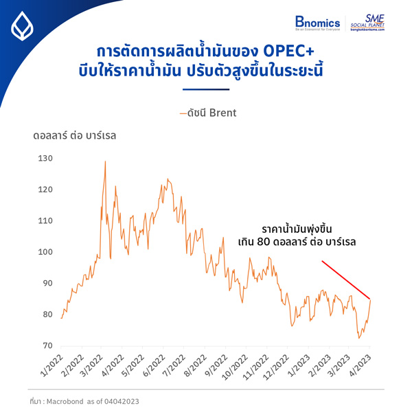 ความผันผวนสำคัญอีกอย่างที่เกิดขึ้นในช่วงที่ผ่านมา เกิดขึ้นหลังจากที่กลุ่มประเทศ OPEC+ ตัดสินใจอย่างเซอร์ไพร์สตลาด จะลดการผลิตน้ำมันดิบลงกว่า 1.6 ล้านบาร์เรลต่อวัน ซึ่งส่งผลให้ราคาน้ำมันดิบปรับตัวสูงขึ้นทันทีที่เปิดตลาด อย่างเช่นส่วนราคา Brent ปรับขึ้นราว 6% ในวันเดียว ขึ้นมาอยู่ระดับเกือบ 85 ดอลลาร์สหรัฐต่อบาร์เรล