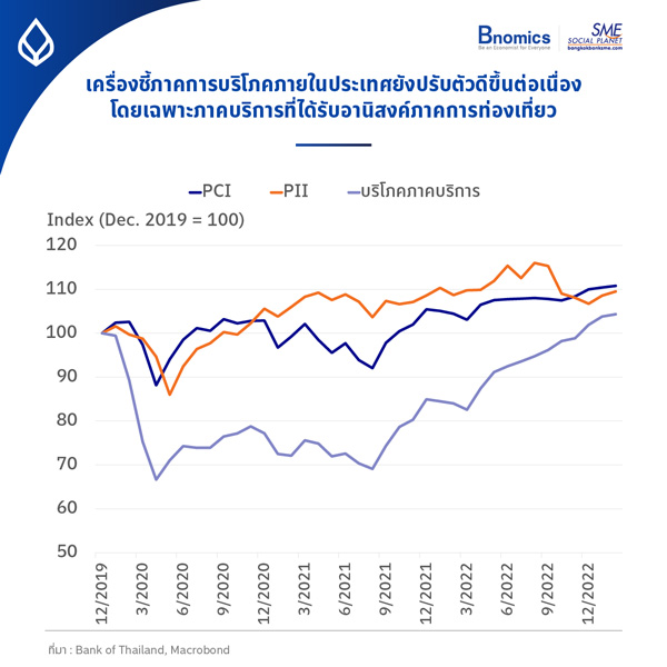 การใช้จ่ายภาคบริการก็ปรับตัวดีขึ้นอย่างต่อเนื่อง ตามนักท่องเที่ยวต่างชาติที่เดินทางเข้ามาเกินกว่า 2.14 ล้านคน ซึ่งหากยังมีนักท่องเที่ยวต่างชาติเดินเข้ามาในอัตราเท่านี้ทั้งปี ไทยจะรับนักท่องเที่ยวต่างชาติราว 25 ล้านคน ซึ่งจะมีช่วยสำคัญในการขับเคลื่อนเศรษฐกิจไทยในปีนี้