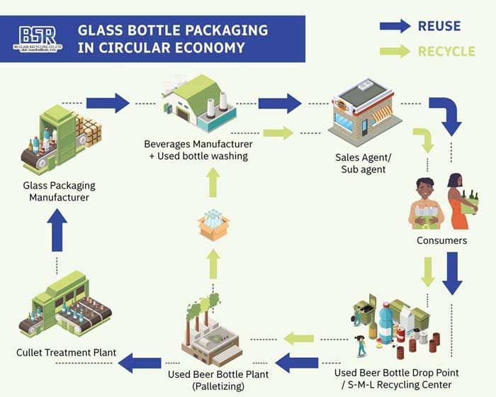 ทั้งนี้ บรรจุภัณฑ์ที่ทำจากแก้วยังนับว่าบรรจุภัณฑ์ที่เป็นมิตรต่อสิ่งแวดล้อม พร้อมทั้งเป็นส่วนหนึ่งในโมเดล Circular Supply Chain ที่อุตสาหกรรมโลกกำลังให้ความสำคัญ เพราะสามารถนำขวดแก้วกลับมา Reuse และนำเศษแก้วกลับมา Recycle หลอมใหม่ได้ ซึ่งปัจจุบันในประเทศไทยสามารถตามจัดเก็บขวดแก้วที่ใช้แล้วกลับมาสู่กระบวนการนำมาใช้ใหม่ได้ถึง 60 - 70% จากจำนวนที่ผลิตไปทั้งหมด ซึ่งสัดส่วนที่หายไปเป็นอาจเพราะส่วนหนึ่งคนไทยยังทิ้งขวดแก้วเพราะมีจุดรับคืนไม่ทั่วถึง ต่างจากประเทศในฝั่งยุโรปที่สามารถตามเก็บขวดกลับมาได้ถึง 90% เพราะมีจุดรับคืนที่เข้าถึงได้ง่าย