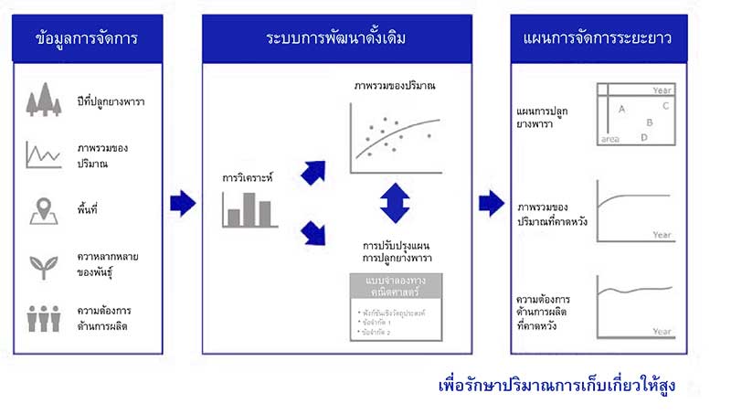 อาทิ วิธีการเพิ่มจำนวนต้นยางในแปลงปลูก รวมถึงขั้นตอนการเก็บเกี่ยวอย่างไรให้ได้ประสิทธิผลสูงสุด