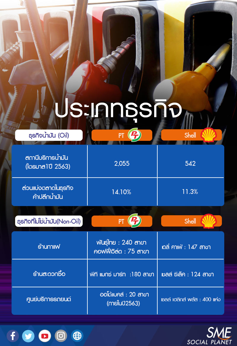 ภาพรวมตลาดค้าปลีกน้ำมันในประเทศในปี 2563 มีแนวโน้มลดลงไม่ต่ำกว่า 5% ปัจจัยหลักมาจากผลกระทบของการแพร่ระบาดไวรัสโควิด 19 ทำให้ความต้องการใช้น้ำมันลดลง ขณะที่ราคาขายปลีกดิ่งลงเป็นประวัติการณ์และค่าการตลาดที่ต่ำกว่าปกติ เหล่านี้เป็นปัจจัยที่ซ้ำเติมเข้ามาจากเดิมที่ตลาดค้าปลีกน้ำมันมีแรงกดดันจากอัตรากำไรที่ต่ำอยู่แล้วเฉลี่ย 4% รวมถึงการแข่งขันที่ร้อนแรง ไม่ว่าจะเป็นธุรกิจหลักอย่างค้าปลีกน้ำมัน (Oil) หรือธุรกิจที่ไม่ใช่น้ำมัน (Non-Oil) ซึ่งพีทีและเชลล์ ต่างมีการปรับยุทธศาสตร์อย่างสนใจในการที่จะรักษาฐานที่มั่นในธุรกิจหลักพร้อมๆกับเร่งกระจายเสี่ยงในธุรกิจทำกำไรสูง