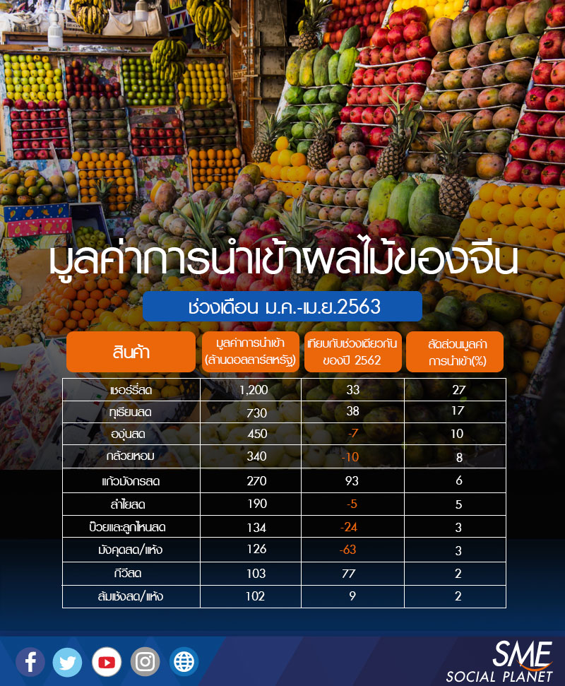 แยกเป็น เชอร์รี่สด 38,400 ล้านบาท ทุเรียนสด 23,360 ล้านบาท องุ่นสด 14,400 ล้านบาท กล้วยหอม 10,880 ล้านบาท แก้วมังกร 8,640 ล้านบาท ลำไยสด 6,080 ล้านบาท บ๊วยและลูกไหนสด 4,288 ล้านบาท มังคุดสด/แห้ง 4,032 ล้านบาท กีวีสด 3,296 ล้านบาท และส้มเช้งสด/แห้ง 3,264 ล้านบาท