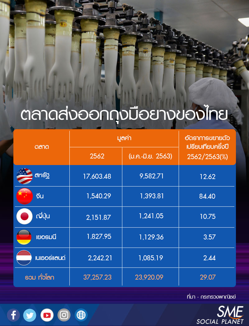 ข้อมูลจากกรมศุลกากรระบุว่า ในช่วง 6 เดือนแรก (มกราคม-มิถุนายน) 2563 ไทยส่งออกถุงมือยางมูลค่าถึง 23,920 ล้านบาท เพิ่มขึ้น 29% จากช่วงเดียวกันของปีก่อน โดยตลาดส่งออกหลักที่ขยายตัวสูง ได้แก่ สหรัฐฯ เพิ่มขึ้น 4.82% จีนเพิ่มขึ้น 9.59% เยอรมันเพิ่มขึ้น 14.5% และสหราชอาณาจักรเพิ่มขึ้นถึง 51%