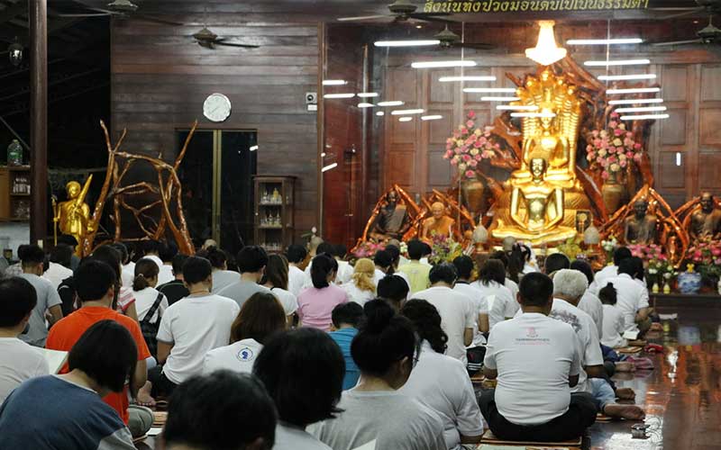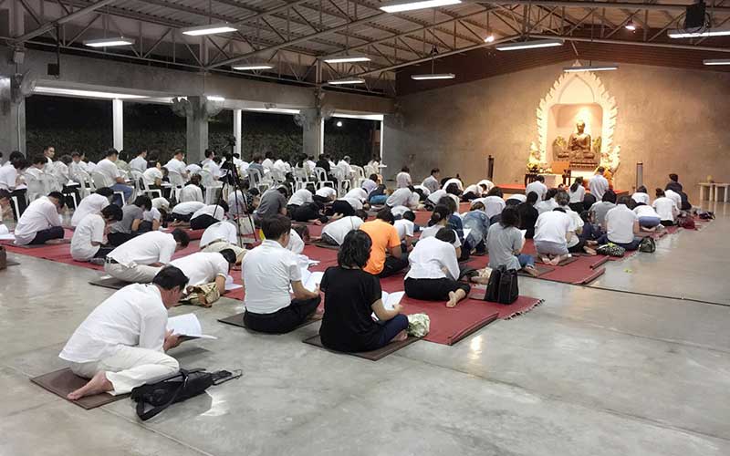 นั่งสมาธิ โดยทางวัดจะเตรียมเบาะรองนั่งไว้ให้ พร้อมกับเปิดเสียงธรรมะให้ฟังตลอดทั้งวัน