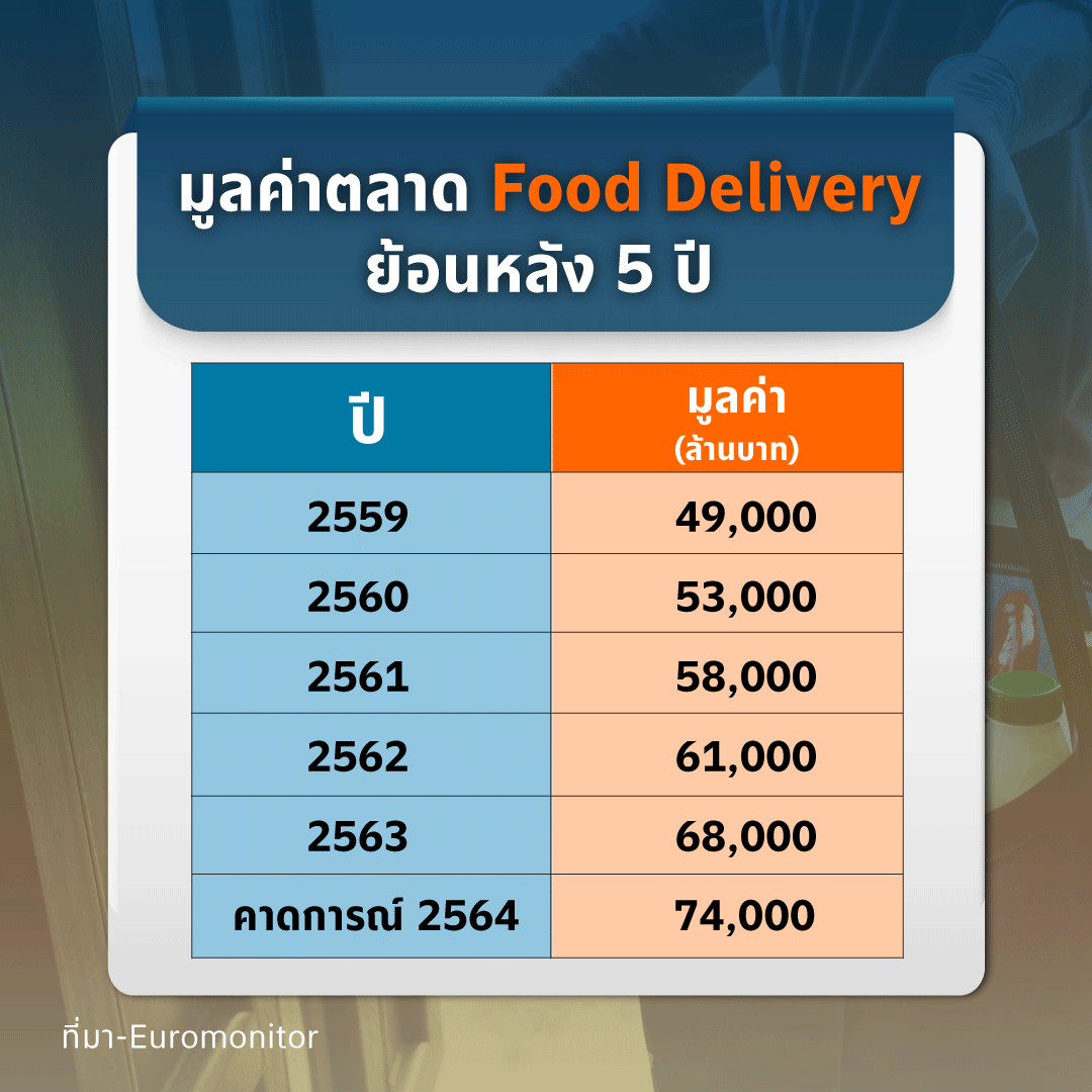 and Markets รายงานว่ามูลค่าตลาด Online Food Delivery ทั่วโลก ปี 2563 สูงถึง 111,320 ล้านดอลลาร์สหรัฐ เติบโต 3.67% จากปี 2562 ที่มีมูลค่า 107,440 ล้านดอลลาร์สหรัฐ