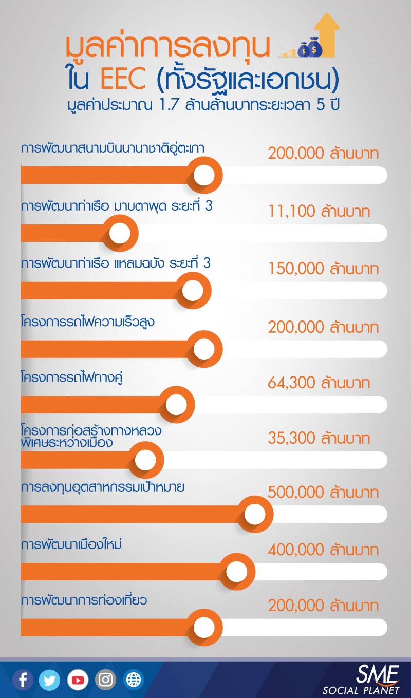 ตัวเลขการลงทุนโครงการ EEC โดยประมาณคือ 1.7 ล้านล้านบาทภายใน 5 ปี (หรือ ประมาณ 300,000 ล้านบาท ต่อปี) สามารถเก็บภาษีเพิ่มขึ้นจากเดิมอีกปีละ 1