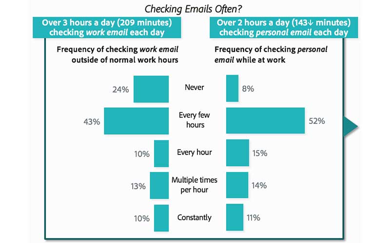 รายงานผลการศึกษาเกี่ยวกับการใช้อีเมลของอะโดบี (“Adobe Email Usage Study”) ประจำปี 2562 ซึ่งสำรวจความคิดเห็นจาก 1,002 คน ช่วงเดือนกรกฎาคม 2562 ระบุว่า ผู้บริโภคใช้เวลาราว 5 ชั่วโมงต่อวัน โดยแบ่งเป็น ใช้เวลาราวๆ 3 ชั่วโมงเพื่อเช็คอีเมลบริษัท และประมาณ 2 ชั่วโมงเพื่อเช็คอีเมลส่วนตัว ผู้บริโภคเหล่านี้รีเฟรชกล่องอินบ็อกซ์ของตนเองในหลายๆ ช่วงเวลาและสถานที่ที่แตกต่างกัน เช่น ขณะที่กำลังดูทีวี บนเตียงนอน ระหว่างการประชุมเรื่องงาน ขณะขับรถ และแม้กระทั่งในห้องน้ำ