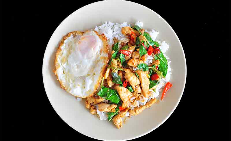 3.ผัดกะเพราไก่ไข่ดาว : เมนูยอดฮิตของร้านอาหารตามสั่งที่คนชอบค่อนแคะให้ขนานนามว่า “เมนูสิ้นคิด” แต่อย่างสบประมาทกันลอยๆ โดยไม่มีข้อมูล ทราบหรือไม่ว่าใบกะเพราช่วยในเรื่องลดไขมันในเลือด ช่วยลดระดับน้ำตาลในเลือด ช่วยป้องกันโรคเบาหวาน และบำรุงลำไส้ เนื้อไก่มีไขมันน้อยจัดเป็นเนื้อสุขภาพย่อยง่าย พริกให้สารแคปไซซินที่ช่วยแก้อาการภูมิแพ้ ไข่ดาวมี มีไบโอติน เต็มไปด้วยสารอาหาร ให้โปรตีนสูง เสริมภูมิคุ้มกัน บำรุงสมองและประสาท มีแคโรทีนอยด์ช่วยในการมองเห็น และอีกหลายอย่างที่มาพร้อมไข่ดาว 1 ฟอง ดังนั้น อย่ามาสบประมาทว่าเมนูสิ้นคิด ตอนสั่งรับประทานที่วิเคราะห์สารอาหารมาครบถ้วนแล้ว