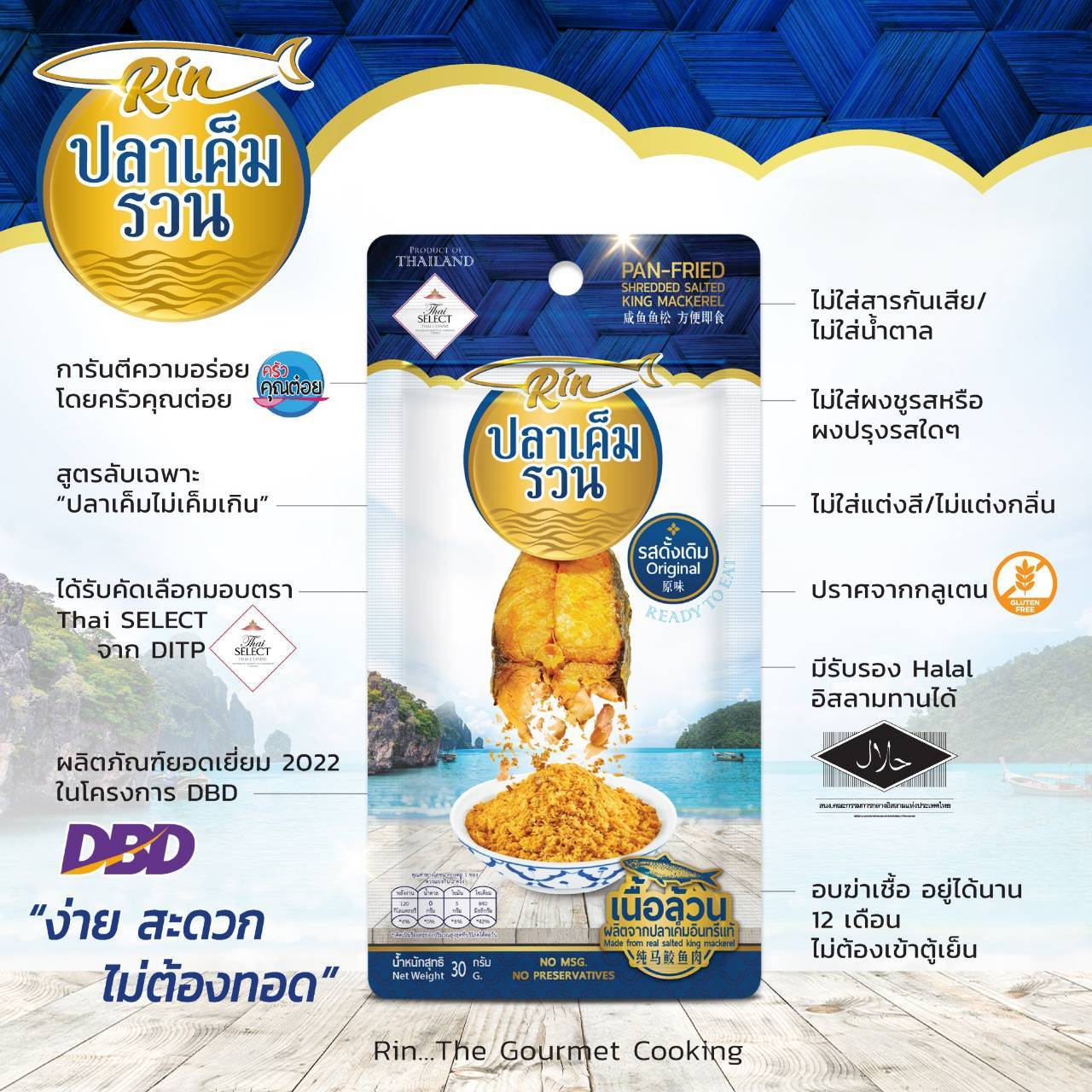 นอกจากนี้ เรายังมีการควบคุมคุณภาพและบรรจุภัณฑ์ที่ได้มาตรฐาน ทำให้สินค้ามีอายุการเก็บรักษานานถึง 1 ปี สามารถรับประทานได้ทุกที่ ทุกเวลา โดย Rin ปลาเค็มรวน มีให้เลือก 2 รูปแบบ คือ แบบซอง 30 กรัม มี 2 รสชาติ ได้แก่ รสเผ็ด และรสกลมกล่อม ส่วนแบบกระปุก 100 กรัม มี 4 รสชาติ ได้แก่ เผ็ด, กลมกล่อม , กระชาย และแซลมอน สามารถหาซื้อได้ทั้งช่องทางออนไลน์ อย่าง Shopee, Lazada และแฟลตฟอร์มโซเชียลมีเดีย เช่น Facebook, Line, IG รวมถึงช่องทางออฟไลน์ เช่น The Mall, Lemon Farm, Rimping, Gourmet, Villa Market, Food Land, Tops Supermarket และ TOPS Daily กว่า 100 สาขาทั่วประเทศ