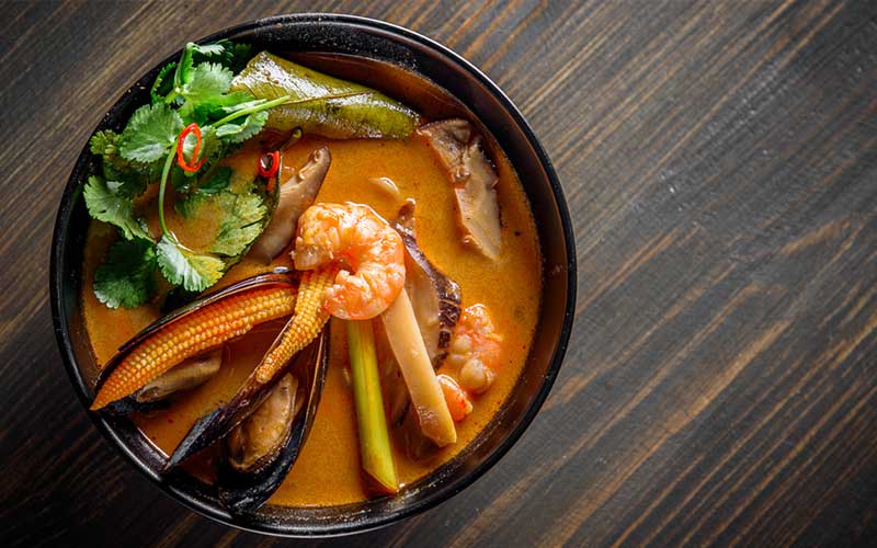 3. ต้มยำ มีส่วนประกอบหลักคือ หอมใหญ่ หอมแดง ซึ่งมีสารสำคัญอย่าง สารเคอร์ซีทิน (quercetin) ที่มีศักยภาพในการป้องกันไม่ให้ไวรัสเข้าเซลล์ ช่วยลดโอกาสการติดเชื้อ อีกทั้งยังมีเห็ดที่มีสารเบต้ากลูแคน ช่วยกระตุ้นภูมิคุ้มกันของร่างกาย ทำให้ไม่ป่วยง่าย และมะนาวที่ใส่ในต้มยำมีวิตามินซีที่มีฤทธิ์ต้านอนุมูลอิสระสูง ช่วยเสริมการทำงานของระบบภูมิคุ้มกัน