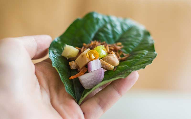 1. เมี่ยงคำ มีส่วนผสมหลักคือ มะนาวหั่นพร้อมเปลือกและหอมแดงสด ทั้งสองอย่างนี้ถือเป็นสมุนไพรที่มีสารเฮสเพอริดิน สารรูติน และวิตามินซี ช่วยป้องกันไม่ให้ไวรัสเข้าสู่เซลล์ของร่างกาย ช่วยลดโอกาสการติดเชื้อในอวัยวะต่างๆ ได้