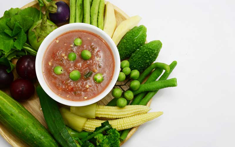 6. น้ำพริกผักต้ม ผักสด ใครที่รับประทานแล้วดีต่อสุขภาพเพราะมีสรรพคุณทางยาในเมนูนี้ให้มากขึ้น เช่น ดอกขี้เหล็ก ยอดมะยม ใบเหลียง ยอดสะเดา มะระขี้นก ฟักข้าว ผักเชียงดา คะน้า มะรุม ผักแพว ผักหลากสี ซึ่งผักเหล่านี้อุดมไปด้วยสารกลุ่มแอนโทไซยานิน ซึ่งเป็นสารกลุ่มเฟลโวนอยด์ที่มีฤทธิ์ต้านอนุมูลอิสระสูง และมีวิตามินซีสูงด้วย