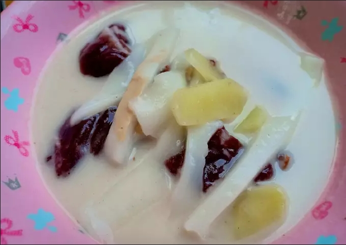 • เตรียมหม้อเคลือบแบบมีฝา เทนมเปรี้ยวใส่ลงไป (ใช้อัตรา 1 ขวด ต่อ เต้าฮวยที่ทำเสร็จแล้ว 1 ซอง) แล้วใส่เต้าฮวยกับผลไม้ตามลงไป คนให้เข้ากัน