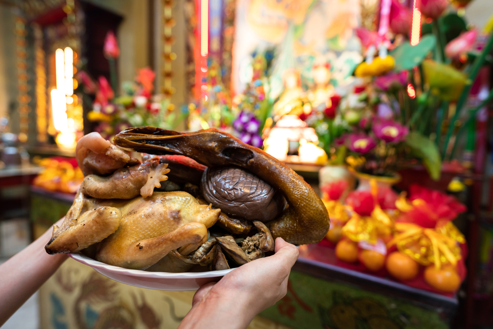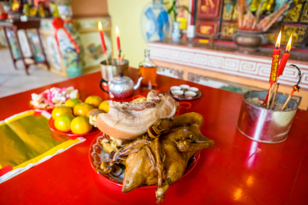 • อาหารไหว้เจ้า (ไก่ต้ม, หมูช่วง, เป็ดพะโล้, ปลา, หมี่ซั่ว)