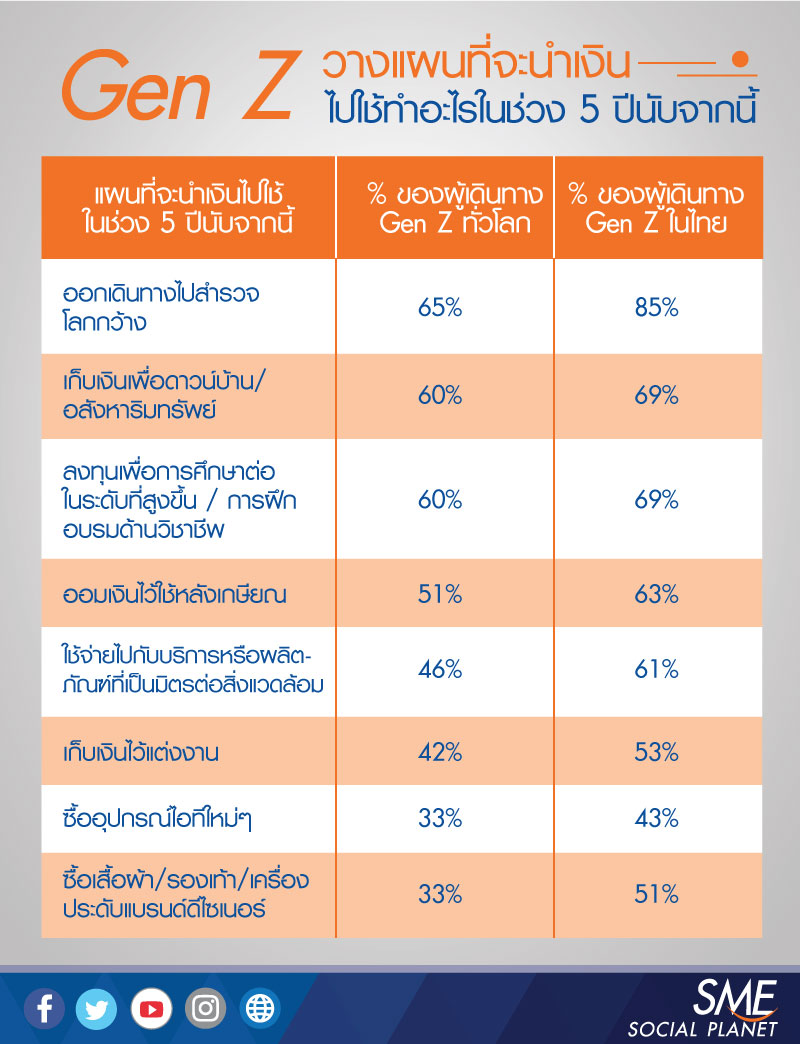 คน Gen Z จำนวน 6 ใน 10 (60%) มองว่าการลงทุนกับการเดินทางท่องเที่ยวเป็นสิ่งที่คุ้มค่าเสมอ และเมื่อจัดลำดับสิ่งที่คนรุ่นนี้จะนำเงินไปใช้จ่าย ผลปรากฏว่า “ออกเดินทางไปสำรวจโลกกว้าง” เป็นสิ่งที่สำคัญที่สุดเป็นอันดับ 1 ของคนรุ่นนี้ (65%) ส่วนการเก็บเงินเพื่อ “การลงทุนครั้งใหญ่ที่สุดในชีวิต” (ซื้ออสังหาริมทรัพย์) มาเป็นอันดับ 2 แต่ที่น่าสนใจคือ การใช้เงินซื้อของต่างๆ กลับอยู่ในอันดับท้ายสุด
