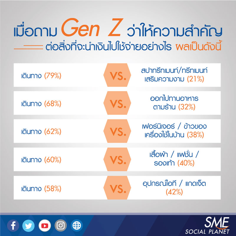 เมื่อถามถึงลำดับความสำคัญของสิ่งที่คน Gen Z จะนำเงินไปใช้จ่าย การเดินทางท่องเที่ยวมาเป็นอันดับแรกในตัวเลือก 5 ใน 7 ของ Gen Z โดยเฉพาะเมื่อเทียบกับการซื้อสิ่งของหรือใช้เงินไปกับประสบการณ์ที่เพลิดเพลินได้เพียงชั่วขณะ โดยการเดินทางอยู่ในอันดับสูงกว่าสิ่งต่างๆ เช่น เฟอร์นิเจอร์ ข้าวของเครื่องใช้ในบ้าน เสื้อผ้า สินค้าแฟชั่น อุปกรณ์ไอทีและแกดเจ็ตต่างๆ การไปทานอาหารตามร้าน รวมถึงสปาทรีทเมนท์และทรีทเมนท์เสริมความงาม