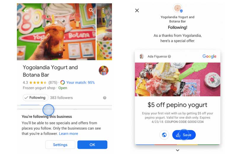 ล่าสุด Google ก็เพิ่มอีกหนึ่งฟีเจอร์เข้ามาใหม่ที่ให้ธุรกิจต่างๆ โดยเสนอรางวัลให้แก่ลูกค้าที่ติดตามร้านด้วย “Welcome Offers” ซึ่งนั่นหมายถึงว่า หากคุณกดติดตามร้านนั้นเป็นครั้งแรก ก็อาจจะเห็นส่วนลดหรือข้อเสนอดีๆ เด้งขึ้นมาเพื่อต้อนรับลูกค้าใหม่เป็นอีกหนึ่งวิธีที่จะทำให้ธุรกิจของคุณมีอันดับที่ดีขึ้นบนหน้า Google