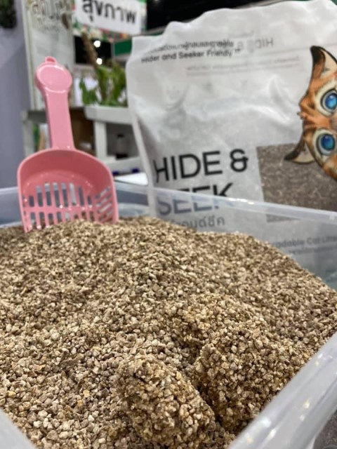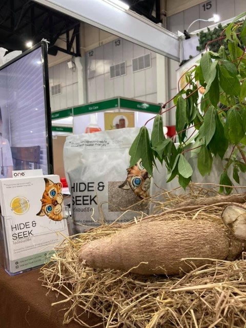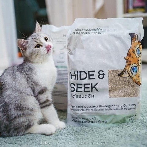 ทรายแมวจากมันสำปะหลัง Hide & Seek เป็นการนำเอามันสำปะหลังมาผ่านการให้ความร้อนและความดันที่เหมาะสม ทำให้เกิดกระบวนการ Pregelatinization กับโมเลกุลของแป้ง เข้ามาช่วยปรับปรุงสมบัติเชิงโมเลกุลของสตาร์ชในมันสำปะหลัง จนได้ทรายแมวเม็ดเล็กละเอียด ที่มีคุณสมบัติดูดซับของเหลวและกลิ่นได้ดีขึ้น ไม่ก่อให้เกิดนิ่วในไตหรือโรคระบบทางเดินหายใจ และยังช่วยเก็บกลิ่นปัสสาวะของแมวได้ดีกว่าทรายแมวทั่วไปตามท้องตลาด
